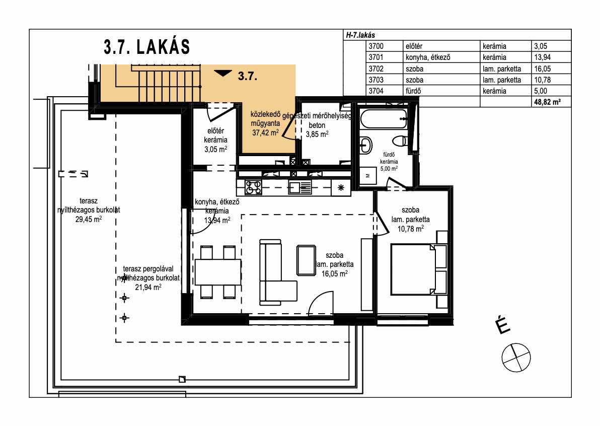 Az épületbe laminált parketta burkolat és mázas kerámia burkolat kerül beépítésre. Teraszokon fagyálló, csúszásmentes greslap burkolat készül. A lépcsőházakban és a közlekedési útvonalakon szintén csúszásmentes, greslap burkolat lesz. A tetőteraszok burkolata 3 cm vastag nyílthézagos fagyálló kő burkolat.